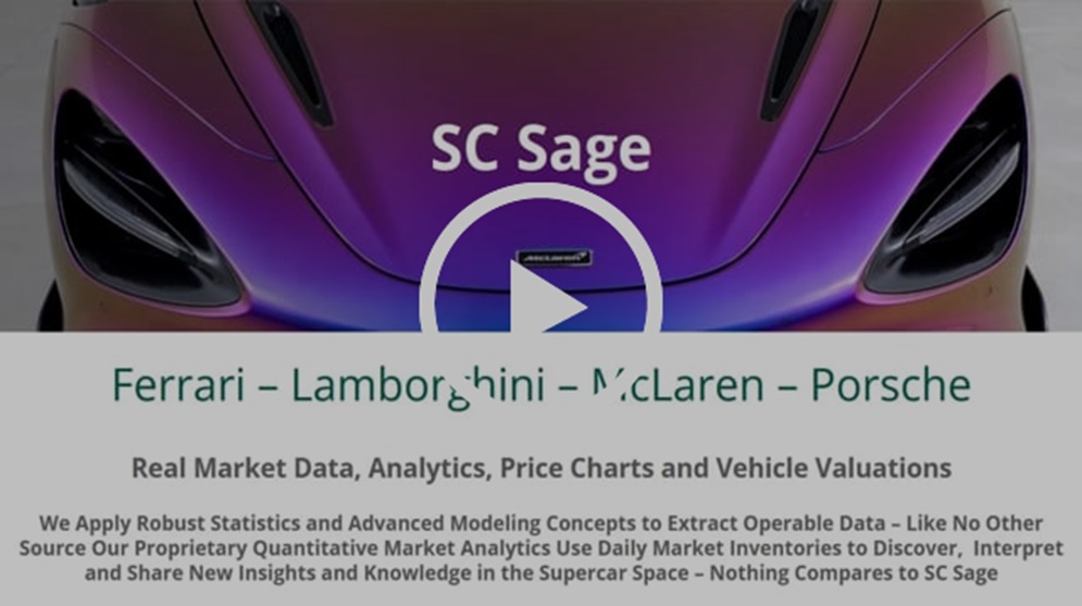 SC Sage is the most innovative and accurate resource for data on the Ferrari, Lamborghini, McLaren and Porsche markets, the vehicles in them and their pricing. Watch the video to get a take on the clear market advantages that our basic tools offer.